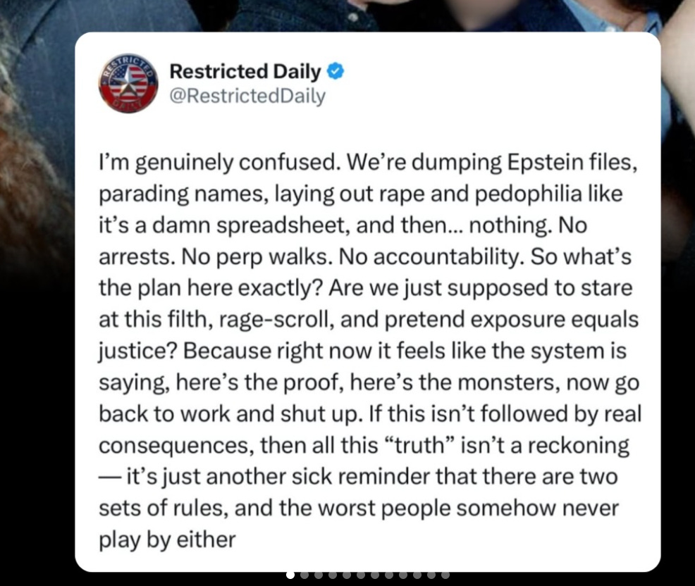 A bit of depressing List this week but this “tweet” sums up the feeling of the week pretty much. This whole mess is to realize that EVERYONE in power is involved - judges, lawyers, presidents, billionairs. How many guess that no one will be charged? Besides maybe Ghislaine Maxwell - because of course - she is a woman.